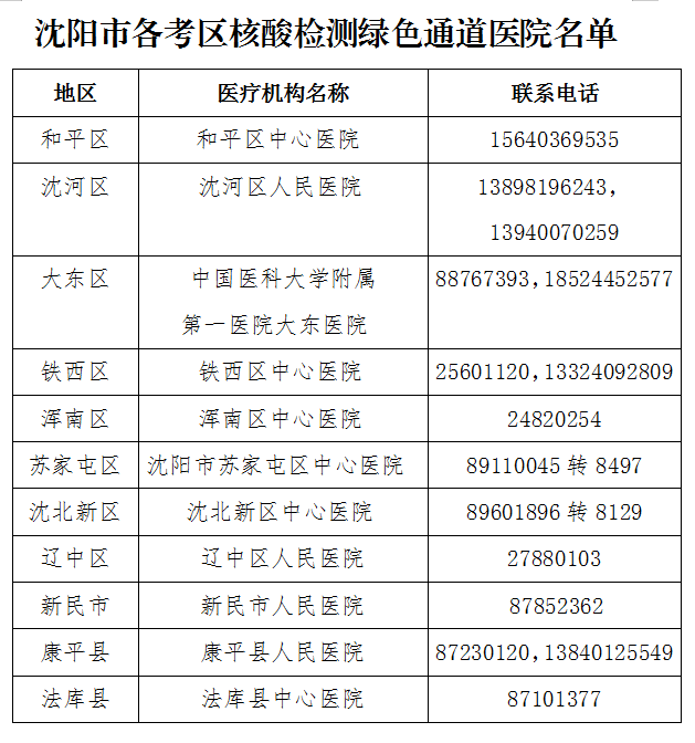 附:沈阳市各考区核酸检测绿色通道医院名单